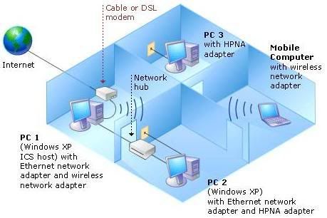 Berikut diagram sederhana yang menjelaskan bagaimana sambungan internet dihadirkan ke dalam kantor atau rumah anda, menggunakan jaringan yang mendukung kabel UTP dan wireless (hybrid) dengan sharing gateway menggunakan sebuah PC server.